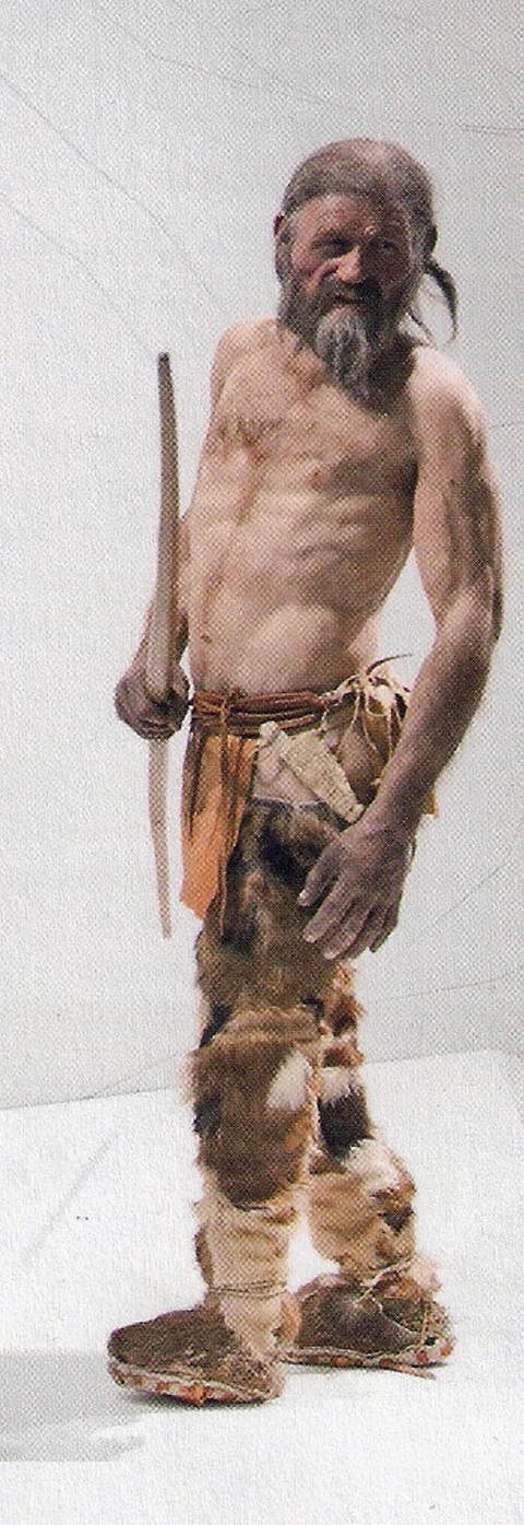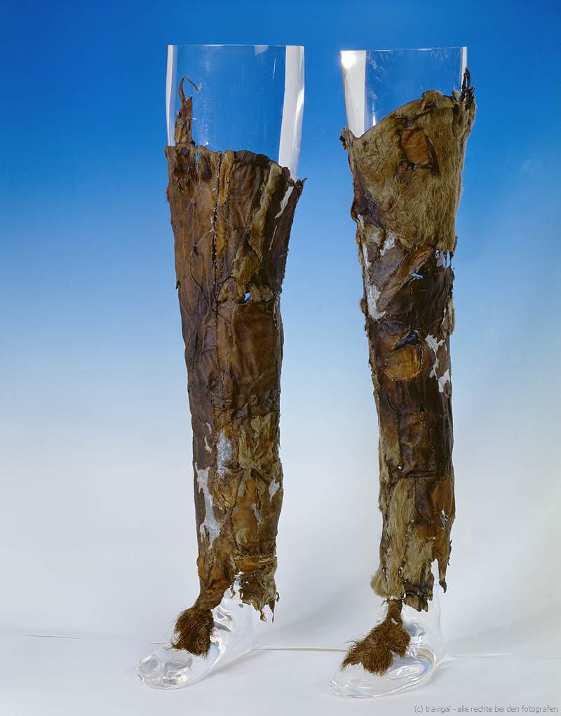 So ungefähr kann man sich den Mann aus dem Eis vorstellen. Ötzi ist ein homo sapiens sapiens, ein Jetztmensch. In heutigen Kleidern würde er im hektischen Treiben unserer Zeit nicht weiter auffallen. Damals trug er die perfekte Outlook-Ausrüstung für seinen Aufenthalt im Hochgebirge: Knielanger Fellmantel und Fellmütze schützten gegen Wind und Kälte, Beinkleider aus Ziegenfell boten viel Bewegungsfreiheit. Mit viel Liebe zum Detail hat er seine Fußbekleidung gefertigt: Der „Innenschuh“ bestand aus einem Grasnetz mit hineingestopftem Heu als Kälteschutz; robustes Hirschleder bildet „Außenschuh“. Überkreuzte Lederriemen gaben der Sohle „Profil“ und damit eine gewisse Rutschfestigkeit. Körpermaße inklusive seiner Schuhgröße von 38 waren Durchschnittsmaße in der Kupferzeit. Heute allerdings ist die Mumie wiegt die Mumie nur noch 13 kg und ist auf 1,54 m geschrumpft.