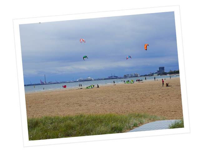 Nachmittags am Strand von St. Kilda ein paar Tage später ein ähnliches Bild: After work ist kite surfing angesagt. Mann und Frau schälen sich aus ihrer Business-Kleidung und zwängen sich in einen Neoprenanzug und gegen 17 Uhr hängt der Himmel voller farbiger Drachen.